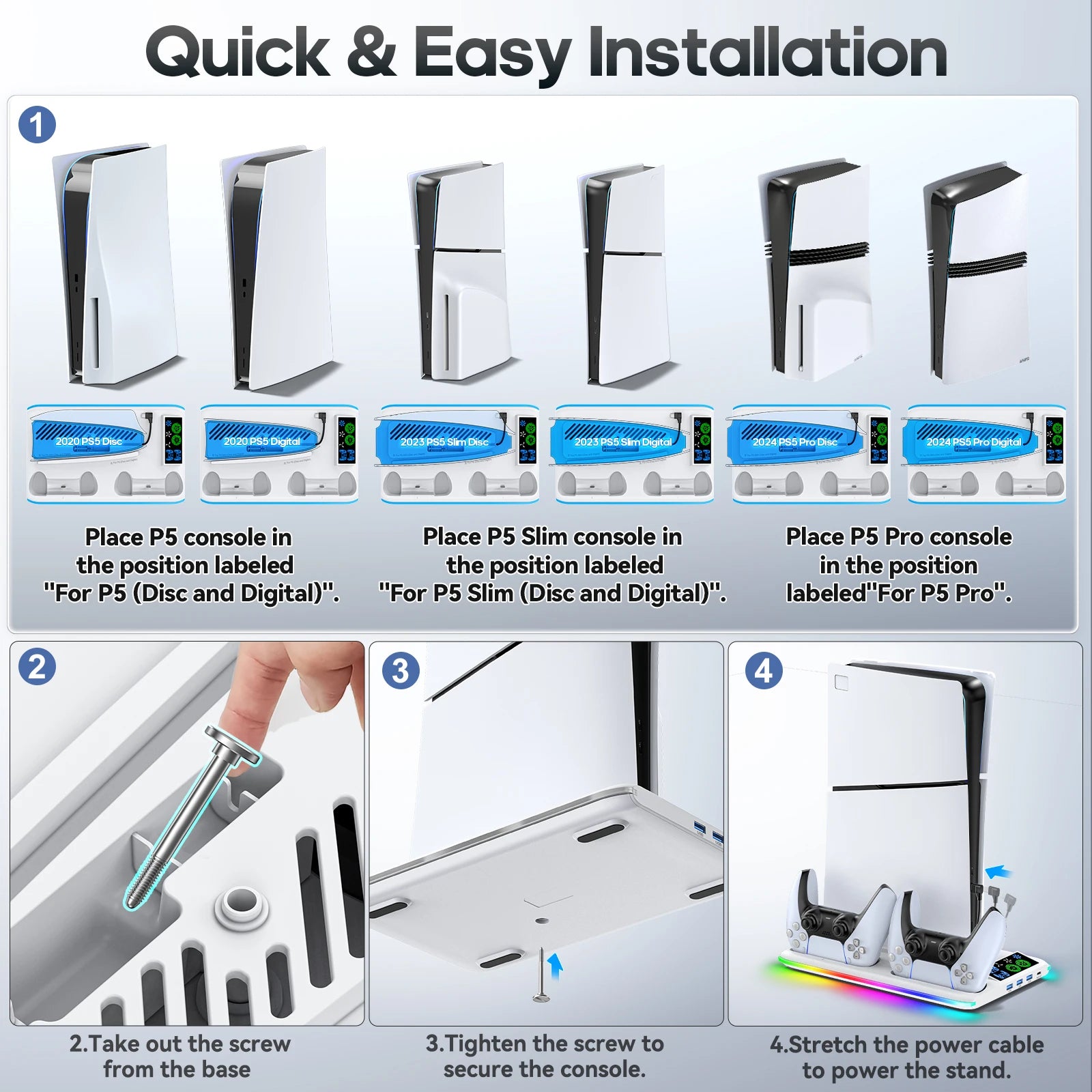 the ultimate 3-in-1 stand built for PS5, PS5 Slim, and PS5 Pro consoles.
